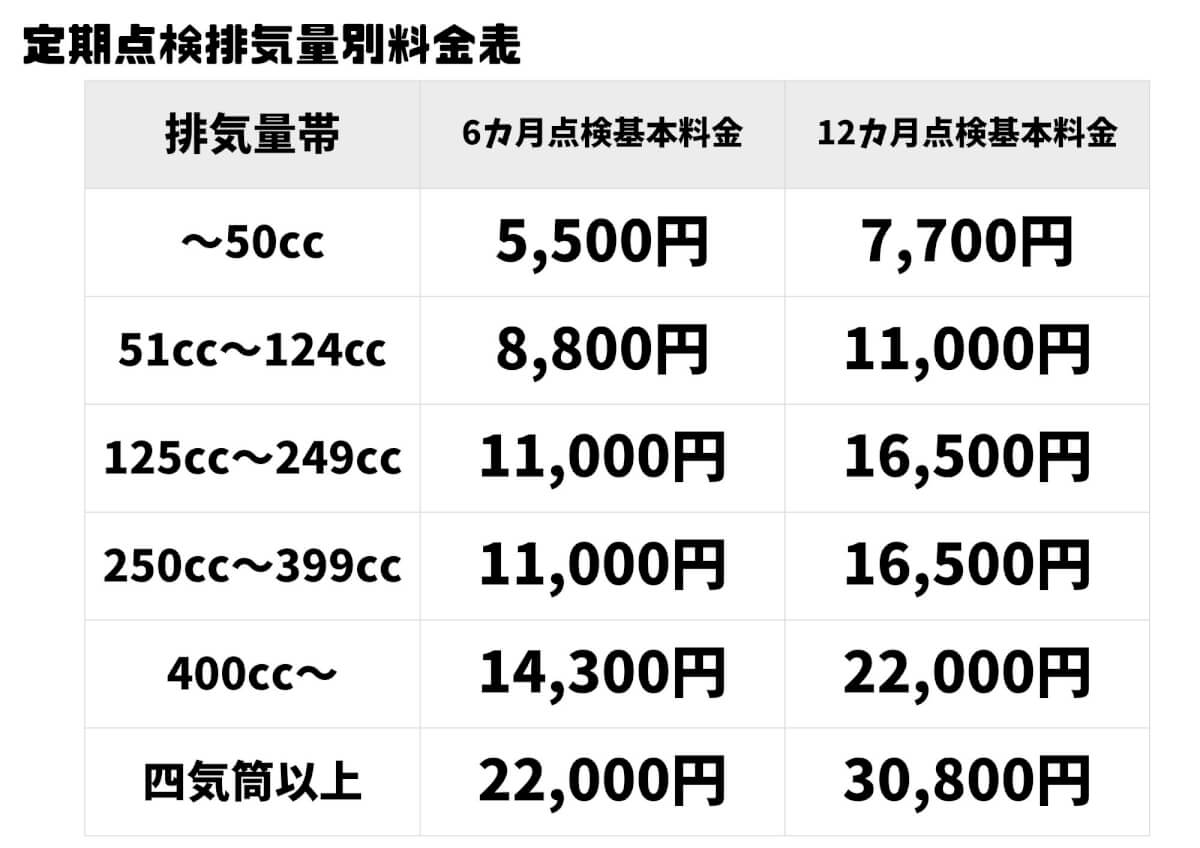 さらに各排気量帯の12カ月点検の費用がプラスされた金額が車検整備料となります。
